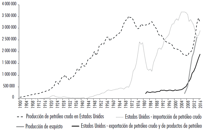 La alta dependencia del petróleo crudo marcada por la necesidad de las importaciones para satisfacer el consumo en ese país, ha llevado a Estados Unidos a querer procurarse fuentes de abastos internacionales y nacionales. A nivel internacional, se registran invasiones, intervenciones y sanciones impuestas a los grandes productores que no son aliados cercanos de Estados Unidos (véase Aponte García, 2016). A nivel nacional, se registran intentos por explotar los grandes abastos de esquisto.