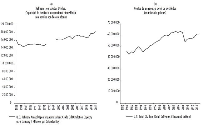 En Estados Unidos, el número de refinerías en operación ha disminuido de 254 en 1982 a 139 en 2016 según datos del EIA. Sin embargo, la capacidad de destilación y las entregas a nivel del detal que alimentan el consumo ha aumentado según muestra las Gráficas 2a y 2b.