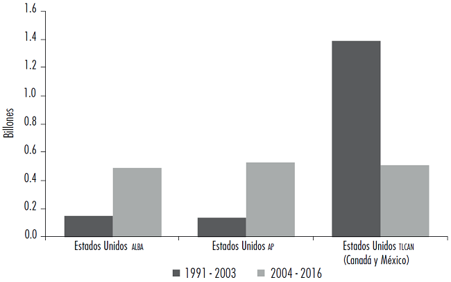 Según ilustra la Gráfica 3, para ambos periodos, Estados Unidos importa más o menos la misma cantidad de hidrocarburos de la Alianza del Pacífico que del ALBA-TCP, analizado en miles de dólares. En los dos primeros casos -Alianza del Pacífico y ALBA-TCP- las cantidades aumentan para el segundo periodo. En el caso del TLCAN, las importaciones disminuyen para el segundo periodo, casi igualando las del ALBA-TCP y la Alianza del Pacífico.
