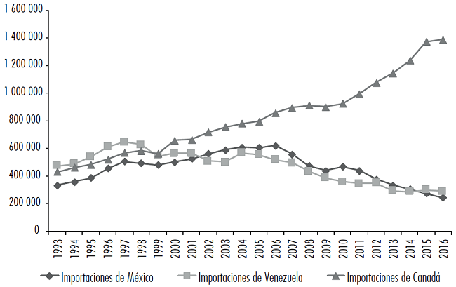 En términos de los objetivos de este trabajo y de los datos presentados en esta sección, se destacan dos procesos: 1) el cambio o reestructuración en las importaciones de petróleo crudo; 2) el aumento en la producción de crudo en Estados Unidos potencialmente relacionada con la fracturación hidráulica, pero también con el aumento en las importaciones de bienes primarios de petróleo, para luego elaborar los productos a lo largo de la cadena en Estados Unidos y aumentar las exportaciones. En la próxima sección se abordan estos asuntos desde la perspectiva de los regionalismos Alianza del Pacífico, ALBA-TCP y TLCAN y de los tres países que son importantes productores petroleros al interior de cada espacio: México, Venezuela y Canadá.
