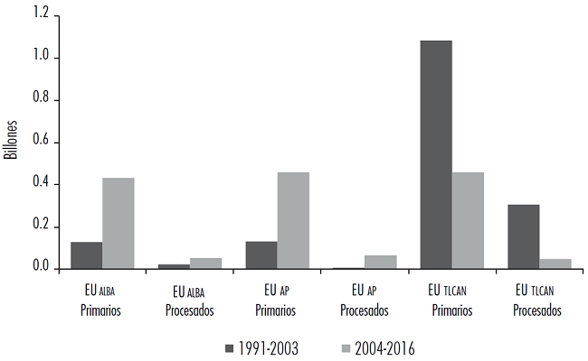 La Gráfica 5 muestra la composición de las importaciones de hidrocarburos por categoría económica amplia y por categoría de regionalismo. En los tres casos de regionalismo predominan los bienes primarios. Sin embargo, Estados Unidos aumenta las importaciones de bienes primarios del ALBA-TCP y de la Alianza del Pacífico durante el periodo 2004-2016 mientras que las disminuye del TLCAN.