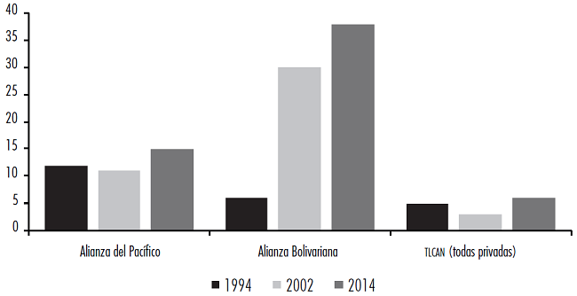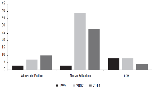 Para efectos del análisis que nos ocupa, se han organizado los países en tres grupos: Alianza del Pacífico, TLCAN y ALBA-TCP.