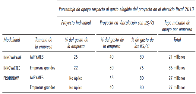 El PEI se compone de tres subprogramas: el INNOVAPYME complementa con recursos públicos la inversión en IDTI de micro, pequeñas y medianas empresas.2 El INNOVATEC incentiva la inversión en IDTI de las empresas grandes. Ambos permiten a todas las empresas tener patentes, productos, procesos o servicios novedosos que mejoren su competitividad y fomenten con ello las ventajas competitivas de cada región o entidad del país. El PROINNOVA fomenta el flujo de conocimiento entre actores empresariales de ambos tamaños con IES y CI, e incentiva la creación y permanencia de redes de innovación o alianzas estratégicas para el desarrollo de proyectos, en campos precursores del conocimiento que se traduzcan en productos, procesos o servicios de alto valor agregado, con impacto regional, sectorial y social.