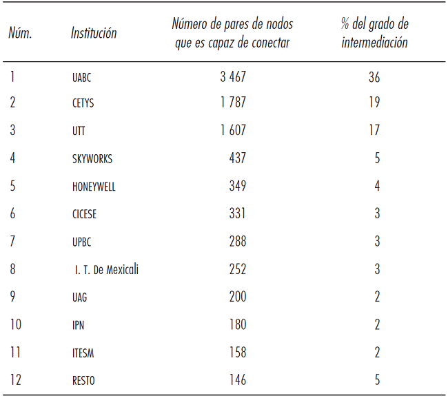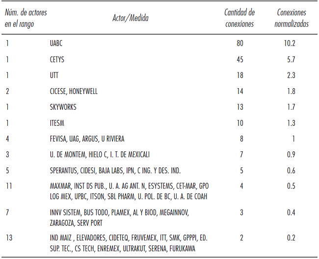 El actor con más conexiones dentro de la red es la universidad pública estatal UABC con 80 conexiones, lo que la ubica en el centro del sistema de innovación. Resalta el caso de las empresas Honeywell con 14 y Syworks con 13 conexiones. Más conexiones significan mayor confianza y generan más posibilidades de futuras relaciones con nuevos actores dentro de la red.