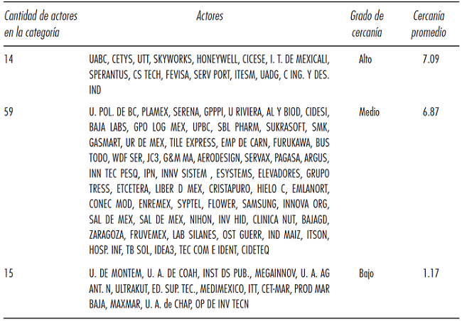 El alto grado de cercanía indica que los nodos tienen buena capacidad para conectarse con los demás actores de la red con menor esfuerzo, lo que es indicador de la existencia de aprendizaje, ayuda o influencia dentro del SRI (Hanemman, 2002). Esto se debe a que quienes más propician la conexión con el resto de los actores son las IES, con 14 nodos; mientras en la categoría media se ubican empresas, principalmente.