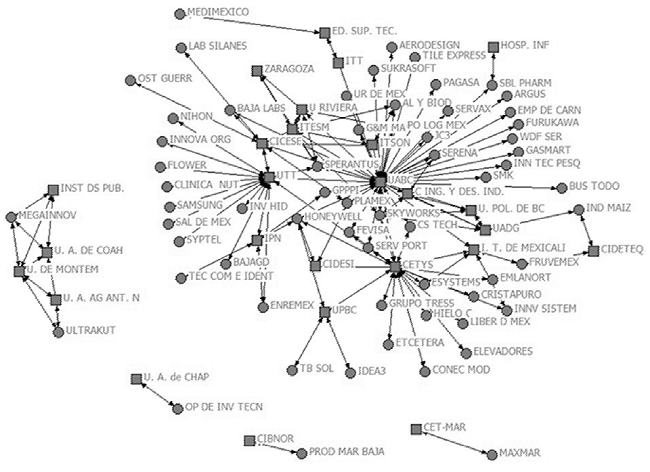 El sistema se compone por 62 empresas, 18 universidades y 6 centros de investigación (14 locales y 10 foráneos), para un total de 82 actores. El grupo de las empresas se compone por tres categorías: 35 micro y pequeñas, 15 medianas y 12 grandes. Las relaciones predominantes en la red son duódicas, ya que existe una vinculación recíproca entre las empresas y las IES en proyectos con más de una vinculación. Al situar la empresa como coordinadora del proyecto, se genera una centralidad que no incentiva relaciones IES-IES, pues sólo funciona entre IES y empresa por separado. Este peso empresarial fragmenta los proyectos con participaciones específicas por cada universidad, que sólo conocen una parte del proyecto más amplio en que están trabajando. Este mecanismo protege la información sobre las estrategias y los productos de las empresas, pues aun cuando se firman cartas de confidencialidad con las IES, se refuerza la protección ante la natural propensión de los académicos a divulgar el conocimiento a través de su publicación.