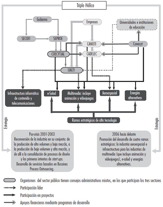 Es central en la formación y articulación de la armadura institucional de la estrategia la constitución del Instituto Jalisciense de Tecnologías de la Información (IJALTI) en el 2001, pero no es sino hasta el 2003 cuando asume su forma actual de organismo principal de la Triple Hélice, en tanto que núcleo de la APP que agrupa en su Consejo Directivo al gobierno estatal, la industria y las universidades e instituciones educativas. Por su parte, las universidades e instituciones educativas cobran un papel activo en la provisión de cuadros a la industria, bajo la dirección de ésta, con la formación del Centro de Integración Industria y Academia (CIIA) en el seno de CANIETI, para garantizar la dirección empresarial del proceso.