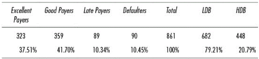 Por un lado, están a aquellos individuos considerados como "excelentes pagadores" (EP) y "buenos pagadores" (BP), que engloban el grupo de "prestatarios con baja mora" (PBM). Los primeros muestran una condición de perfecto cumplimiento del pago, sin haber presentado retraso alguno durante los años de análisis. Para los BP se admite un máximo de retraso mensual, considerado un plazo contingente y sin mayores percances administrativos para la institución, tanto en términos de liquidez como de solvencia financiera.