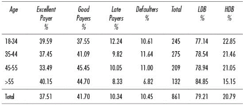 Edad. Los resultados obtenidos dejaron en manifiesto que el menor nivel de morosidad se encuentra entre los pagadores de mayor edad, con casi 85% de los prestatarios calificados como EP y BP. De esta forma, las cohortes de individuos mayores presentan aproximadamente la mitad de prestatarios incobrables que el resto de las categorías, así como una marcada reducción de morosos. Por lo tanto, la hipótesis en esta materia no se cumplió (véase Cuadro 2).