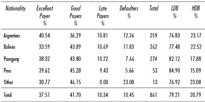 Nacionalidad. La distribución de los prestatarios en cuanto a su nacionalidad indica que se dividen en tercios entre paraguayos, argentinos y bolivianos, con una minoría de originarios de Perú. Del análisis composicional de la categoría surge que, a pesar de que la proporción de morosidad se mantiene relativamente constante para cada una de las nacionalidades, existe una notable diferencia en la variable is. Los argentinos y bolivianos tienen la mayor presencia de prestatarios con mora superior al trimestre (12.36 y 11.83%, respectivamente), en comparación con los prestatarios paraguayos y peruanos, con proporciones sustancialmente inferiores (7.66 y 5.66%, respectivamente) (véase Cuadro 3). Esto es coherente con la opinión de los agentes de crédito que evaluaron que los prestatarios de origen paraguayo tienen un comportamiento más puntual, y nuevamente no responde a la hipótesis original que no los diferenciaba por nacionalidad.