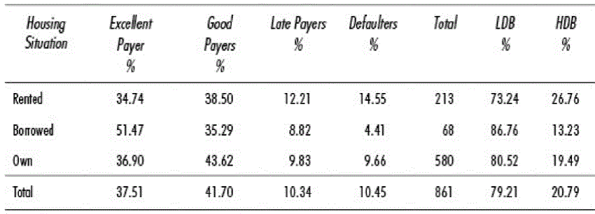 En cuanto a la situación residencial, los resultados obtenidos demuestran que los prestatarios que alquilan son los que más retraso en el pago presentan, ya que exceden en su proporción de incobrables y morosos al resto de las opciones residenciales, también corroborado por el análisis econométrico. Un resultado auxiliar es el buen comportamiento de los prestatarios que viven en una casa "prestada". Otra variable que comprobó la hipótesis planteada es la correspondiente a personas en el hogar, ya que a partir de los siete integrantes se reveló una tendencia hacia la incobrabilidad. En contraposición, los emprendedores que viven solos resultaron los más puntuales en el pago.