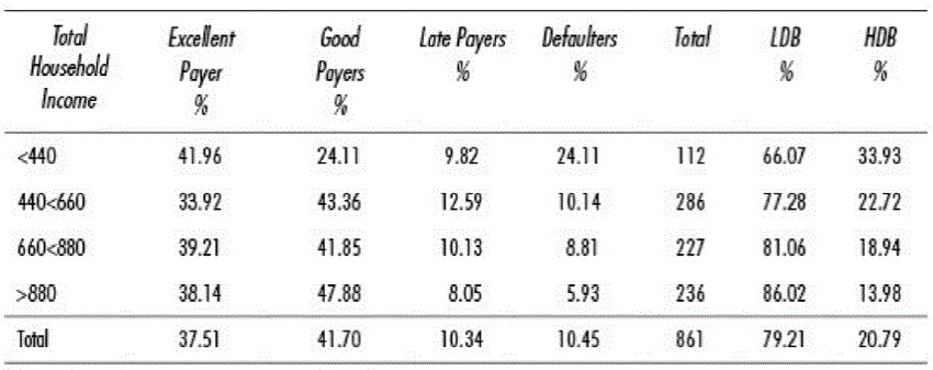 A considerar la capacidad de endeudamiento de los microempresarios, se asume que los prestatarios con menores ingresos tendrían una mayor tendencia hacia la morosidad, por ser más vulnerables en los momentos de crisis. En contraposición, los de mayores ingresos tendrán más capacidad de ahorro, y podrán financiar proyectos más redituables. Asimismo, si un hogar posee una elevada tasa de dependencia sobre el ingreso, producto de más integrantes en edad de inactividad laboral por sobre aquellos activos, el ingreso per cápita será menor, como también la capacidad de ahorro.