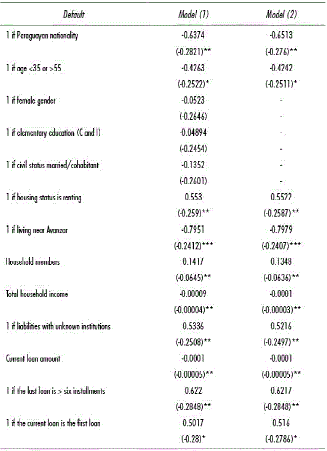 Así, el modelo final queda determinado por las siguientes variables significativas: a) la nacionalidad, ya que si el prestatario es paraguayo, se reducen las probabilidades de ser incobrable; b) la edad, ya que si el prestatario tiene menos de 35 años o es mayor a 55 disminuye la probabilidad de ser incobrable; c) la situación de la vivienda, ya que si el prestatario alquila, aumentan las probabilidades de ser más impuntual; d) la zona de residencia, ya que la cercanía a la institución influye negativamente en la probabilidad de retraso de los prestatarios; e) la cantidad de personas en el hogar, que impactan positivamente en la probabilidad de retrasarse en el pago; f) el ingreso del hogar, ya que cuando éste aumenta, disminuye la probabilidad de ser incobrable; g) si el prestatario tiene un crédito con otras instituciones no reconocidas, aumenta su probabilidad de ser incobrable; h) el monto del crédito, como indicador de la longevidad del vínculo con la institución; tiene una relación negativa con la probabilidad de retraso; i) el plazo del crédito, ya que, si es mayor a seis cuotas, incrementa las probabilidades de ser incobrable, y j) si el prestatario transita el primer crédito, sus probabilidades de ser incobrable son mayores.