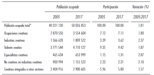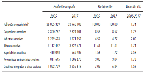 Es a partir del tridente creativo que se tiene una medición más exacta del empleo creativo en México, la combinación de la información sectorial y ocupacional permite identificar y cuantificar a toda la población, ya sea con una ocupación creativa o que trabaje en un sector creativo, además de que toma en cuenta al amplio espectro de empleo informal que caracteriza a economías como la mexicana. Al mismo tiempo, permite distinguir con mayor claridad cómo se encuentra la estructura del empleo creativo a lo largo de las ocupaciones y los sectores. Por ejemplo, los especialistas creativos (personas con ocupaciones creativas en sectores creativos) tienen menor participación en el empleo creativo (1.15 en 2017); en contraste, los creativos integrados a otros sectores tienen una participación cuatro veces mayor que los primeros (5.8 en 2017).7