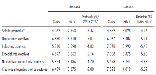 El empleo creativo -a lo largo del periodo de estudio- registró tasas de crecimiento positivas; sin embargo, no sucedió lo mismo con los salarios que presentaron un descenso generalizado que afectó, además de la población ocupada total, a los grupos de mayor ingreso. La reducción es mayor en áreas urbanas (véase Cuadro 4), en especial para los especialistas creativos (5.60%); a pesar de ello, los salarios urbanos son en promedio 10% más altos.