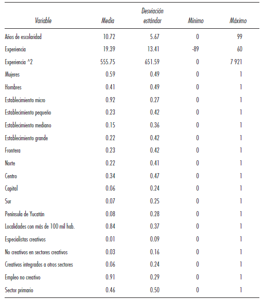 Para determinar el impacto que la economía creativa tiene sobre los salarios urbanos de México, se analiza a nivel de trabajador la variación en los ingresos salariales bajo la presencia de una ocupación vinculada a las actividades creativas. Por conveniencia se utiliza una función de ingresos de corte minceriano -Mincer (1974)-, a la que se le añade para los propósitos de esta investigación variables ocupacionales vinculadas al empleo creativo que se han visto en la sección anterior.8 En este contexto es importante señalar que está ampliamente documentado para el caso mexicano que el poder explicativo de la variable educativa disminuye considerablemente cuando se integran categorías ocupacionales (Valdivia y Pedrero, 2011; Garza y Quintana, 2014).
