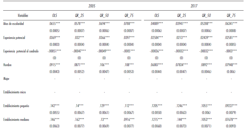 El coeficiente asociado al tamaño de establecimiento, se reduce conforme se avanza en la distribución de la variable dependiente, es decir, en el cuantil más alto el efecto de trabajar en unidades económicas pequeñas o grandes no es tan significativo (respecto a las micro); al contrario, es en la parte baja donde este tipo de características implica una variación considerable en el salario, aun cuando el valor de los coeficientes presenta una disminución entre 2005 y 2017.