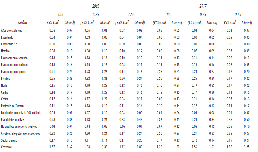 Los principales resultados obtenidos en la presente investigación apuntan a que el empleo creativo, sobre todo el asociado a las industrias creativas y culturales, está convirtiéndose en un componente relevante para entender la discriminación salarial de los salarios urbanos en México. Asimismo, el estudio demostró que los efectos del empleo creativo son heterogéneos a lo largo de la distribución sobre todo en los salarios que tienden a ser más altos. Se encontró a su vez evidencia de que el empleo no creativo que está inserto en industrias creativas y culturales empieza a jugar un papel relevante en la explicación de la variación salarial, lo cual puede estar asociado a los posibles efectos multiplicadores que las industrias de servicios avanzados pudieran estar generando sobre el empleo y los salarios de otros servicios locales asociados (Moretti, 2013).