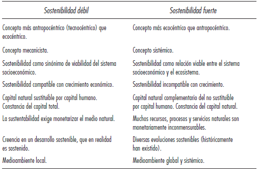 Las diferencias entre sostenibilidad débil y fuerte se sintetizan en el siguiente cuadro comparativo: