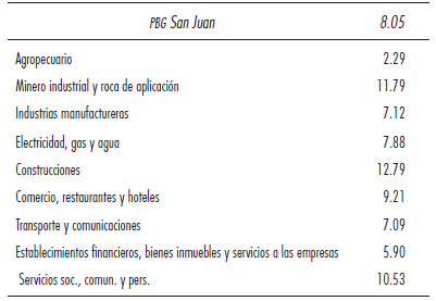 Como se observa en el Cuadro 3, en la década 2005-2015 el oro tuvo una tasa de crecimiento de 60%, y aportó en promedio 4.1% al PBG de San Juan y 31.7% (en promedio) al sector de las industrias manufactureras.