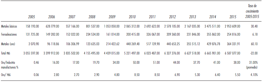 Por otro lado, el rubro que da cuenta de la producción de oro es el de industrias manufactureras (cuenta Metales Básicos, subcuenta Metales no Ferrosos) que hasta 2004 registraba un valor nulo. Sin embargo, en el PBG de San Juan registra un crecimiento que va de ARS$2 070.9 en 2005 a ARS$364 331.9 en 2015. La tendencia comienza en 2005 con la entrada en producción de Veladero, y fue en aumento con el aporte de Gualcamayo (2007) y Casposo (2009) con un continuo crecimiento que se interrumpió en 2013 por la caída del precio del oro, el incremento de los costos y la suspensión de Pascua Lama.