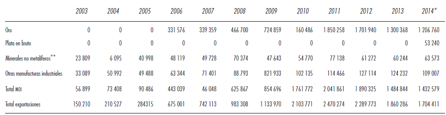 Las exportaciones de San Juan crecieron desde 2003 hasta 2011, pero fue a partir de 2012 que hubo una caída, tal como se oberva en el Cuadro 4. En 2014, la estructura exportable se concentraba en manufacturas de origen industrial (MOI) con 84%, básicamente en el rubro de metales metalíferos (88%). El resto se distribuyó en 12% de manufacturas de origen agropecuario (MOA) y 4% de productos primarios. En MOI, 84% de los envíos son de oro. En el mismo año, 70% de las exportaciones sanjuaninas son del mismo metal. Estos procesos ponen de manifiesto la perspectiva cepalina que caracteriza a las economías periféricas heterogéneas y especializadas,12 en los que existen sectores modernos con poco efecto de arrastre en el resto de las actividades domésticas y con una demanda que se abastece fundamentalmente con importaciones, sobretodo en una provincia cuyo desarrollo manufacturero es mínimo.