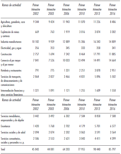 No obstante, en el total provincial es una de las de menor participación en la estructura laboral. Todas las empresas vinculadas a la rama de minas y canteras (incluidas las no metalíferas) absorben 3 302 sanjuaninos, lo que equivale sólo a 3.8% del empleo local en el primer trimestre de 2016, y menos de 2% de la PEA provincial.14 Una cifra realmente pequeña para una actividad económica que se aparecía como la gran fuente generadora de empleo.