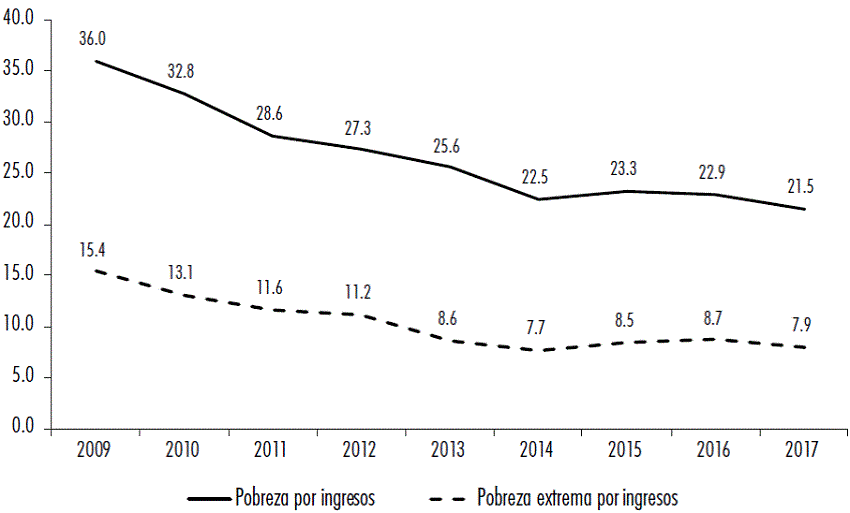Como consecuencia del ciclo económico bajo, los indicadores laborales sufrieron un retroceso y la tendencia a la baja de la pobreza monetaria se desaceleró. Para 2017, el crecimiento del PIB alcanzó 3% (BCE, 2017), y con ello se observó una mejoría en cuanto a reducción de pobreza, ubicándose ésta en 21.5% y la pobreza extrema en 7.9%.
