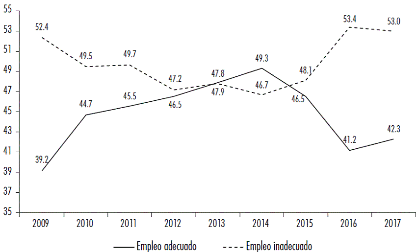El comportamiento de la pobreza monetaria está influenciado principalmente por las remuneraciones que perciben los miembros del hogar, y que dependen sobre todo del nivel educativo y la categoría de ocupación. Al respecto, a pesar de que en 2017 el desempleo a nivel nacional alcanzó 4.6%, una de las tasas más bajas de la región; el empleo adecuado4 se redujo en 7 puntos porcentuales desde su pico más alto en 2014 (49.3 a 42.3% en 2017). Lo que significa que más de la mitad de la pea (53%) se encuentra en empleo inadecuado,5 evidenciando así un deterioro de los indicadores laborales (véase Gráfica 2).
