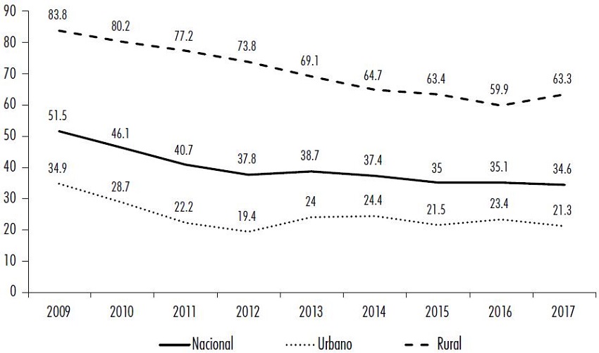 La pobreza multidimensional nacional pasó de 51.5% en 2009 a 35% en 2015 y se ubicó en 34.6% en 2017. Mientras que entre 2009 y 2015 a nivel urbano pasó de 34.9 a 21.5% y a nivel rural de 83.8 a 61.4%. Para 2017, la pobreza multidimensional urbana alcanzó 21.3% y la rural 63.3% (véase Gráfica 3). La reducción de la pobreza multidimensional entre 2009 y 2017 se debe por lo general a la ampliación del acceso a los servicios básicos de agua y saneamiento, así como al incremento de la asistencia a la educación básica y bachillerato. No obstante, su estabilidad entre 2015 y 2017 se explica por qué esta métrica incorpora indicadores que han sido afectados por el ciclo económico bajo: pobreza extrema por ingresos, desempleo o empleo inadecuado, no contribución al sistema de pensiones y empleo infantil y adolescente (véase Anexo 2).