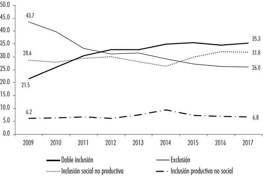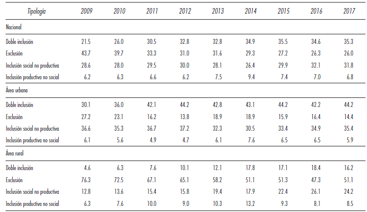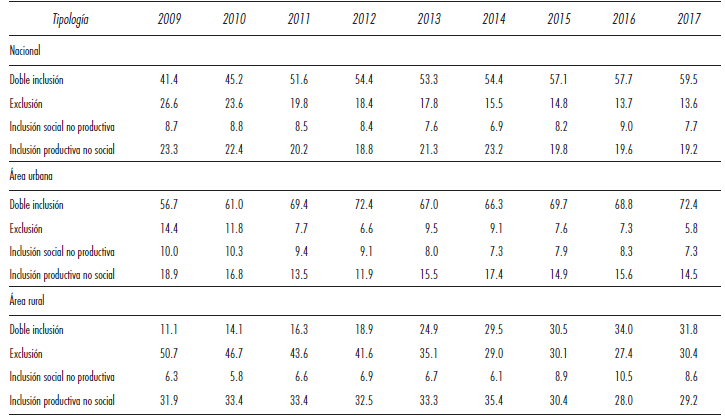 A continuación se presentan las estimaciones de la tipología de inclusión social y productiva en Ecuador para el periodo 2009-2017 (mayores detalles sobre las estimaciones a nivel nacional y por área, véanse anexos 3 y 4).