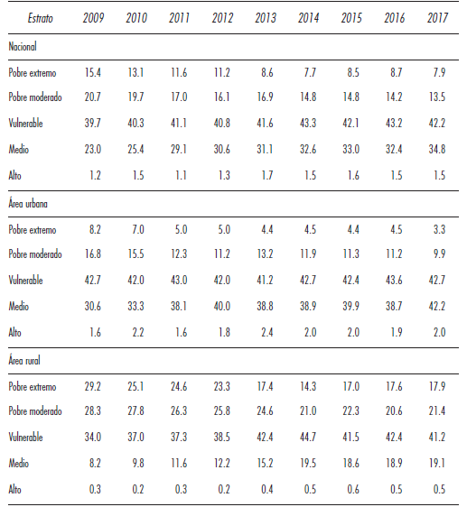 Con base en la aplicación de la propuesta metodología del Banco Mundial (2013) para la estimación de los estratos sociales pobre, vulnerable, medio y alto,3 se observa que junto a la disminución de la pobreza entre 2009 y 2017 existió un importante incremento del estrato medio que pasó de 23 a 34.8% (véase Anexo 1). Es de llamar la atención la importante proporción de la población que se ubica en el estrato de vulnerabilidad y que alcanzó 42.2% en 2017 respecto a 39.7% en 2009, población que dadas sus características se encuentra en un sitial con alto riesgo de caer en pobreza. Según al área geográfica, en 2017 en el área urbana 42.7% de la población se encontraba en el estrato vulnerable y 42.2% en el estrato medio; mientras que en el área rural la vulnerabilidad ascendió a 41.2% y el estrato medio a 19.1%.