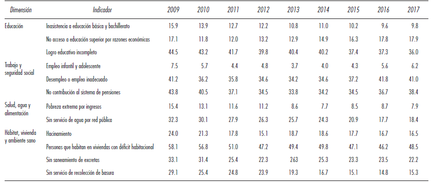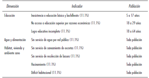 En el Cuadro 2 se presentan los 12 indicadores que conforman la pobreza multidimensional oficial agrupados en las cuatro dimensiones arriba señaladas. Conforme a la metodología adoptada en la dimensión de salud, agua y alimentación, la pobreza extrema por ingresos constituye un proxy de la capacidad del hogar para cubrir las necesidades alimenticias mínimas de sus miembros, mientras que en relación con la temática de salud no se cuenta con información. En palabras del INEC, dadas las características de la fuente de información "una de las ventajas de trabajar con la ENEMDU es que permite reconstruir el índice desde 2009; una de las limitaciones de la fuente es que carece de indicadores que reflejen los derechos a la salud (acceso a servicios de salud) y de ciertos grupos vulnerables (niños, discapacitados, adultos mayores)" (INEC, 2016, p. 5).