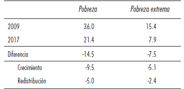 Aplicando la metodología de descomposición crecimiento-redistribución de la pobreza por ingresos (Gasparini et al., 2013), la reducción de la pobreza registrada entre 2009 y 2017 se explica en 65.4% (9.5 puntos porcentuales) como resultado del crecimiento económico y en 34.6% (5 puntos porcentuales) por la redistribución; mientras que la reducción de la pobreza extrema se debe en 67.7% (5 puntos porcentuales) al crecimiento y en 32.3% (2.4 puntos porcentuales) a las políticas redistributivas (véase Cuadro 1).