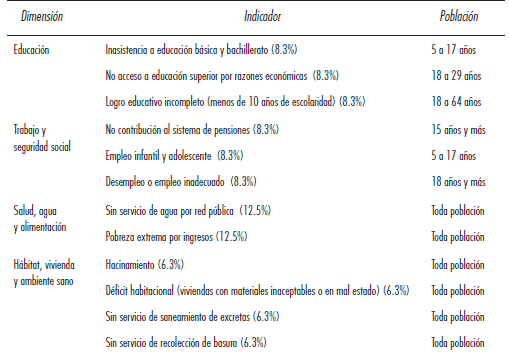 Desde una perspectiva multidimensional, la pobreza refleja privaciones simultáneas en varias aristas del bienestar con base en un enfoque de derechos, de este modo, su utilidad radica en la identificación de las respuestas de política pública para combatir las causas que la originan (Deleeck et al., 1992; Santos, 2013; Bourguignon y Chakravarty, 2003; Alkire y Foster, 2007).