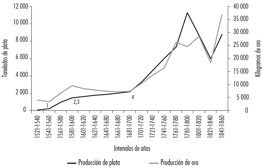 En retrospectiva, la explotación mineral durante la Colonia fue reducida en sus resultados debido al escaso desarrollo de las fuerzas productivas, si se la compara con las técnicas contemporáneas. Para dimensionar la cantidad de plata exportada a Europa durante el periodo colonial, se comparó la cantidad extraída entre 1521 a 1830, algo más de tres siglos, y que equivale a 56 144 kilogramos, con la producida de 2000 a 2010, es decir, tan sólo una década, equivalente a 33 465 kilogramos. De esta forma queda claro que en este último periodo se extrajo más de la mitad de plata que la que se obtuvo en 310 años de la época colonial (González Rodríguez, 2011). La gráfica 1 muestra el comportamiento de la producción de oro y plata durante la Colonia, y se puede apreciar que la introducción de una nueva tecnología coadyuvó a elevar la producción.