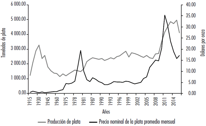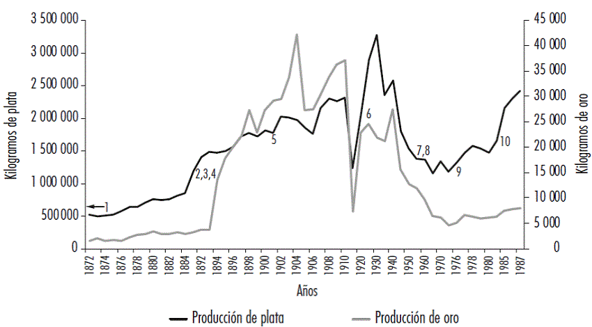 Durante la Revolución mexicana, la producción minera sólo se vio afectada durante los primeros años: la producción de plata se redujo de 2 305 748 a 1 230 750 kilogramos de 1910 a 1915 (INEGI, 2010), empero, esta situación se recuperó después de 1916, como respuesta al aumento de los precios durante la Primera Guerra Mundial (1914-1918) (Tello, 2008). Durante la Segunda Guerra Mundial, Estados Unidos fue el principal destino exportador de México, no sólo de minerales, sino también de productos agropecuarios y de manufacturas, los cuales superaron las exportaciones mineras (Tello, 2008). De hecho, la producción de plata disminuyó de 2 570 394 a 1 900 352 kg de 1940 a 1945, al igual que la de oro, de 27 468 a 15 530 kilogramos durante el mismo periodo (INEGI, 2010).