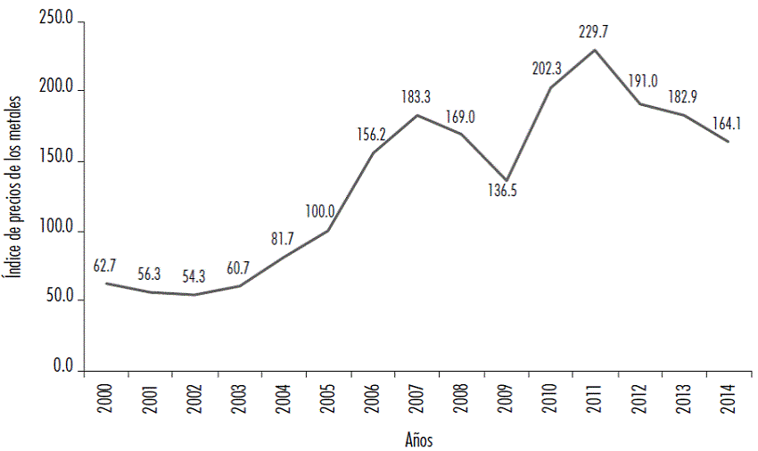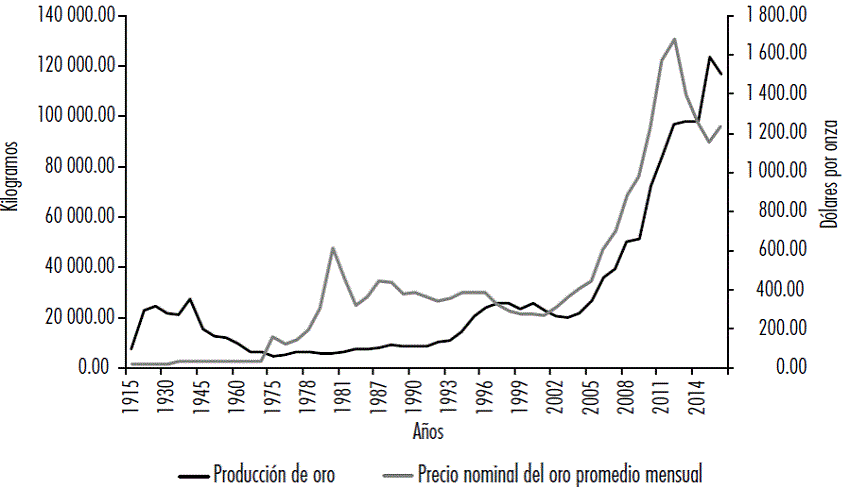 El cuarto periodo inició a principios del siglo XXI con el aumento de los precios internacionales de los metales, en pleno auge de la política económica neoliberal (véase Gráfica 3). En México, este aumento incrementó la producción de diversos metales como el oro y la plata (véanse Gráficas 4 y 5).
