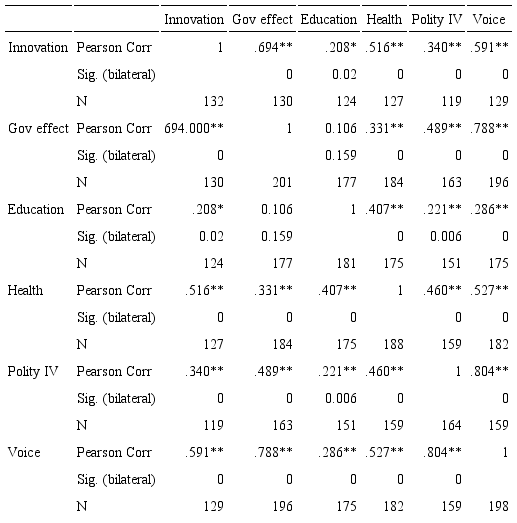 Unbalanced developmental States (Cluster 2). This cluster is composed of 64 developed and developing countries. In particular, all Latin American countries (except Cuba), some South and East European countries and some African and Asian States are in this group. These States have low economic and social efforts with four indicators slightly under the overall average (Innovation, Government effectiveness, Education and Health). However, their Democratic quality is above the overall average, while Voice and accountability remains low but close to the average.