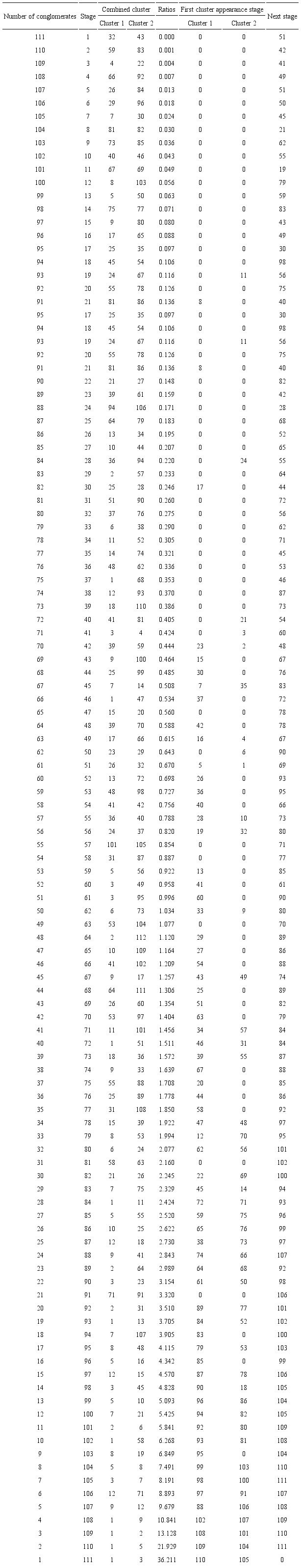 The next step is to decide on the number of DS groups (that is, the number of clusters to retain from the data). This decision is based on three different criteria: the agglomeration schedule (see Appendix 2), the dendrogram (see Figure 2) and the variance ratio criterion (see Table 2).