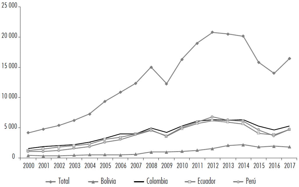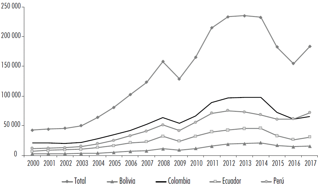En la Figura 1 se muestra el flujo comercial9 de la CAN y de sus miembros para el periodo 2000-2017. Durante ese periodo el comercio intra-bloque de la CAN ha sido en promedio de US$230 750 millones, donde Colombia, Ecuador y Perú han tenido un flujo comercial similar. Bolivia es el país con menor comercio intra-bloque, con tan sólo 8% del total.