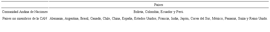 El modelo se basará en 4 países origen (i = 4), que son los 4 países miembros de la CAN y 20 países de destino (j = 20) que son los principales socios comerciales de los países miembros de la CAN. La lista de estos países se muestra en la Tabla 1. El estudio abarca el periodo 2000-2017 (t = 18). Por lo tanto, el modelo tiene 1 368 observaciones debido a que los 4 países de la CAN también están incluidos en la lista de los 20 principales socios comerciales.