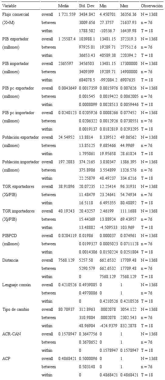 En el caso de las variables de control, la variable PIB es construida a partir de la multiplicación de los PIB de los países de origen y destino en millones de dólares a precios constantes de 2010, utilizando la base de datos de Indicadores de Desarrollo del Banco Mundial. La variable población es construida multiplicando la población en millones de personas del país de origen y de destino, usando la base de datos de Indicadores de Desarrollo del Banco Mundial. La variable diferencia de los PIB per-cápita es construida obteniendo la diferencia entre el PIB per-cápita en millones de dólares a precios constantes de 2010 del país i y el país j en valor absoluto, basándose en los datos de los Indicadores de Desarrollo del Banco Mundial. La variable cociente de comercio entre PIB (TGR, por su siglas en inglés) se construye dividiendo el comercio total del país entre su PIB multiplicado por 100. Estos datos se han obtenido de las estadísticas comerciales de la base de datos de WITS y de la base de datos de Indicadores de Desarrollo del Banco Mundial. Las variables que no cambian en el tiempo, como la distancia y el lenguaje común entre el país de origen y el país de destino, han sido obtenidas de la base proporcionada por Centre d'Etudes Prospectives et d'Informations Internationales (CEPII). La variable distancia está medida como la distancia entre las capitales de los países en kilómetros.12 La variable lenguaje común es medida a través de una variable dummy que toma el valor de 1 si el país i y el país j tienen el mismo idioma oficial o el lenguaje primario, y 0 en cualquier otro caso. La variable tipo de cambio bilateral se obtiene de United Nations Conference on Trade and Development Statistical (UNCTAD STAT).