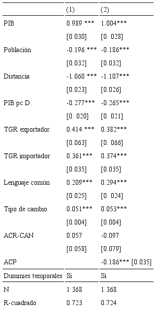En la estimación del modelo, las variables continuas se encuentran en logaritmos (PIB, población, distancia, diferencia entre los PIB per-cápita, TGR del exportador, TGR del importador y tipo de cambio), y el resto de variables son binarias (lenguaje común, ACR y ACP). En la Tabla 3 se presentan dos modelos, un primero que no incluye la variable que representa los acuerdos extrarregionales de la CAN, y un segundo que sí la incluye.