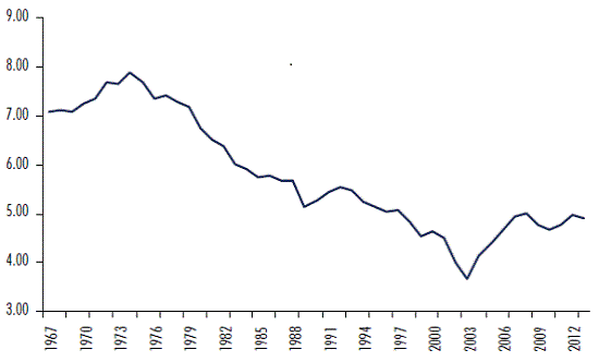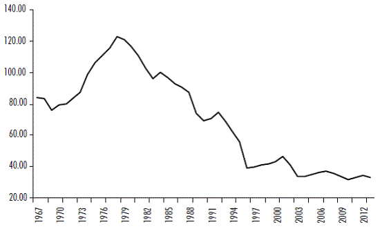 El comportamiento en el tiempo de estas dos variables tomadas en logaritmo, para el periodo 1968-2013, puede observarse a partir de las Figuras 1 y 2. El recorrido de ambas series es similar al de los datos reportados por Baptista (2005), y parece claro que después de un periodo de ascenso ambas variables llegan a un pico a mediados de los años setenta y decrecen tenden cialmente hasta principios de la década de 2000, momento a partir del cual la productividad muestra una leve recuperación, que no muestra a decir verdad el salario real. No obstante, conviene precisar la muy alta asociación positiva entre el salario real y la productividad laboral en series anuales, con un índice de correlación de 0.8719.