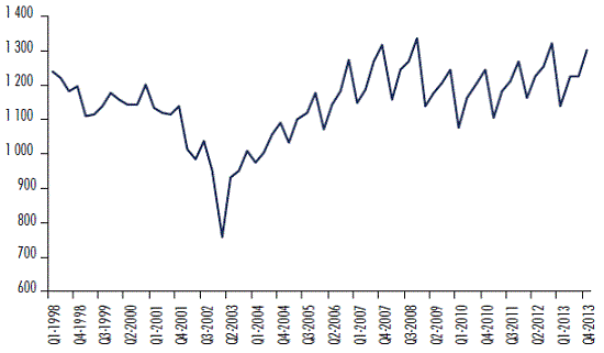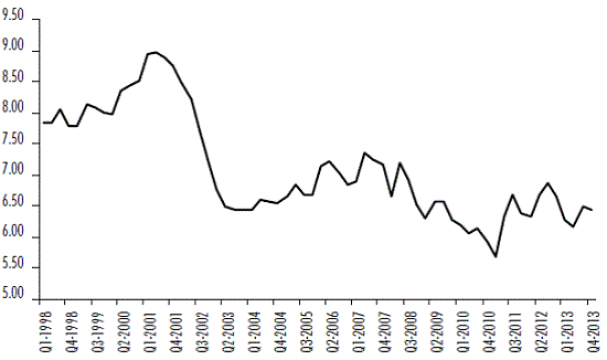 Los datos trimestrales para las variables en estudio se toman para el periodo más largo conseguido que va desde 1998:1 a 20013:4. Corresponde a 64 observaciones para cada serie. Las series han sido construidas de la siguiente manera: