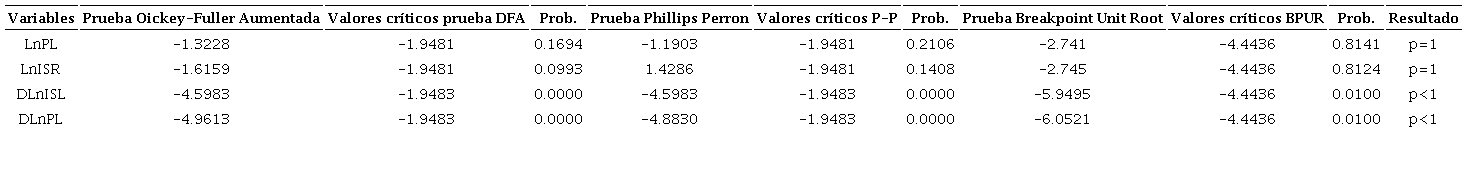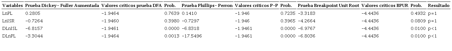 La Tabla 1 recoge los resultados de aplicar las dos pruebas de raíces unitarias sobre la serie de salario real y PL. Para ambas variables en nivel los valores calculados por las pruebas DFA, PP (sin intercepto y sin tendencia) son mayores a los valores críticos, y las probabilidades son todas mayores a 0.05, por lo que se falla en rechazar la hipótesis nula de que hay presencia de una raíz unitaria. La prueba BPUR de igual manera rechaza la hipótesis nula de presencia de una raíz unitaria de las series en nivel. En consecuencia, las variables PL e ISR no son estacionarias en nivel. Al tomar las variables en primera diferencia, los valores calculados de las pruebas son menores a los valores críticos, y las probabilidades son todas menores a 0.05 por lo que se rechaza entonces la hipótesis nula de que las variables son no-estacionarias. En conclusión, ambas pruebas indican que la PL y el ISR son variables estacionarias en primera diferencia.