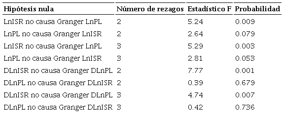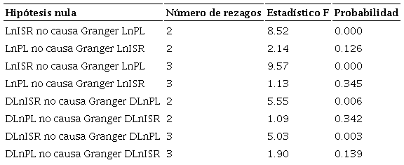Antes de llevar a cabo la prueba de causalidad de Granger se requiere realizar pruebas de raíces unitarias. En la Tabla 5 se muestra a las variables PL e ISR en nivel y en primera diferencia. Las probabilidades arrojadas por las pruebas de DFA, PP y BPUR indican que las variables productividad media del trabajo e ISR son estacionarias en primera diferencia.