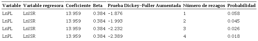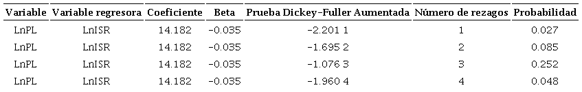 La Tabla 3 muestra el valor de los estimadores (coeficientes) de las regresiones de la PL como variable dependiente y del ISR como variable explicativa. También se muestra la prueba DFA aplicada a los residuos de las regresiones y las probabilidades de cada contraste para distintos números de rezagos. Allí se observa que la prueba DFA sobre los residuos de la regresión con un rezago arroja una probabilidad de 0.058; es decir, al 10% se rechaza la hipótesis nula de que los residuos son no estacionarios, mientras que las pruebas sobre los residuos de la regresión con dos, tres y cuatro rezagos arrojan probabilidades de 0.045, 0.026 y 0.018, respectivamente, y son significativos al 5%, lo que quiere decir que son estacionarios. De esta forma, se puede afirmar que sí existe una relación de largo plazo entre la PL y el ISR para datos anuales.3