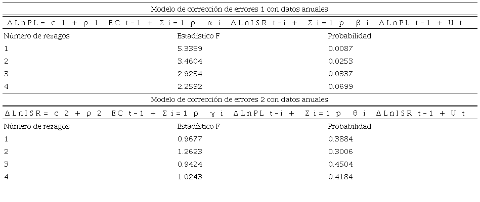 Las pruebas en regresiones hasta con tres rezagos indican, en un primer caso, que los estimadores no son distintos de cero y que el ISR en primera diferencia causa el crecimiento de la productividad laboral. Sólo en una estructura dinámica de cuatro rezagos, el crecimiento del salario no causa al crecimiento de la productividad laboral (al 5% de significación). En contraste, en un segundo caso como se muestra en el modelo de corrección de errores 2, la evidencia no apunta a una causalidad desde la productividad hasta los salarios, pues en ninguna estructura de rezagos la hipótesis nula de significación conjunta de los parámetros γ puede ser rechazada.